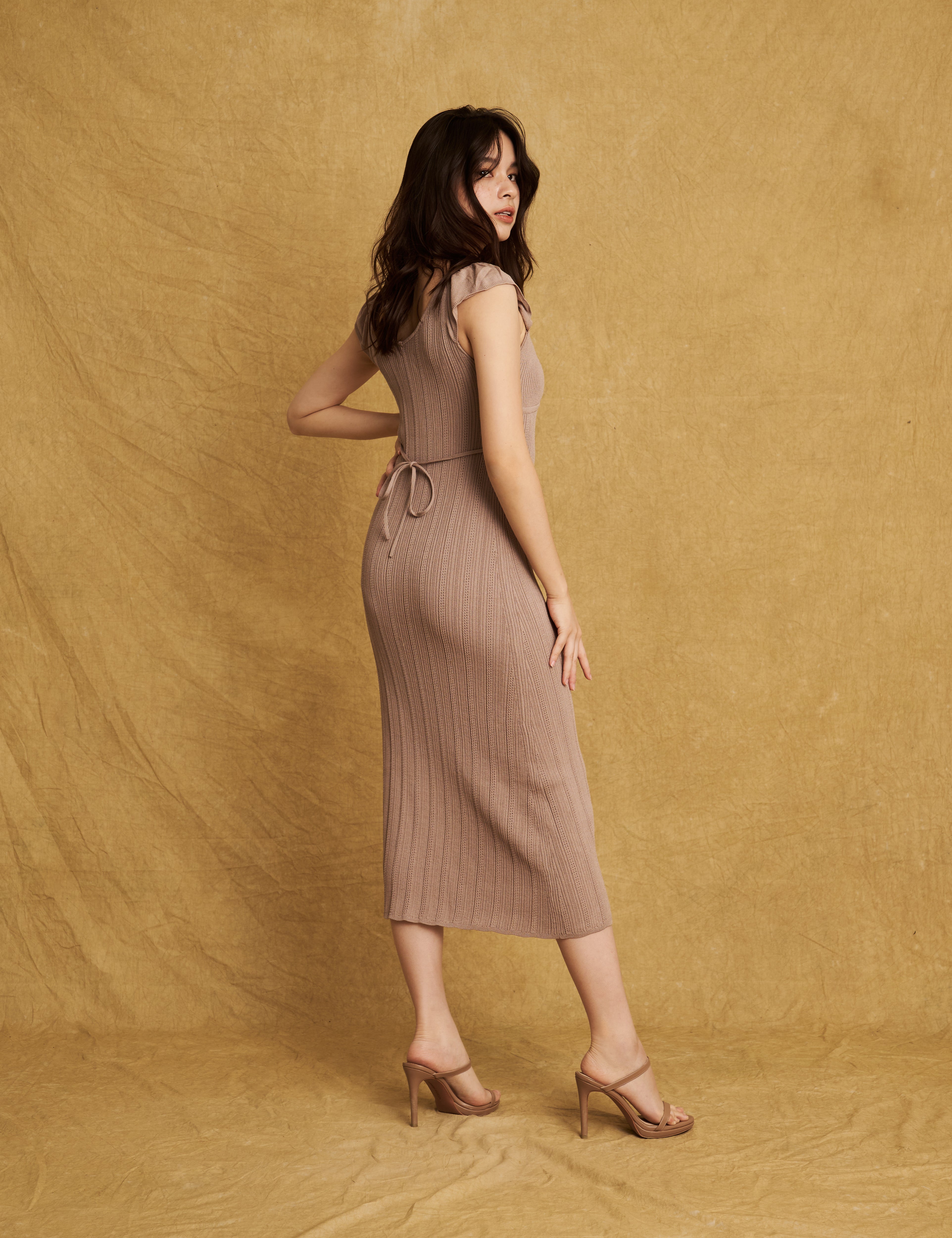 The Gabrielle dress carries a sense of romantic sensuality with a soft muted purple hue, a flowing skirt with a mermaid cut that grazes the ankle, delicate ties to nip in at the waist, a flattering bustier neckline and decorative knit patterns – hello ronron's signature subtle details.
